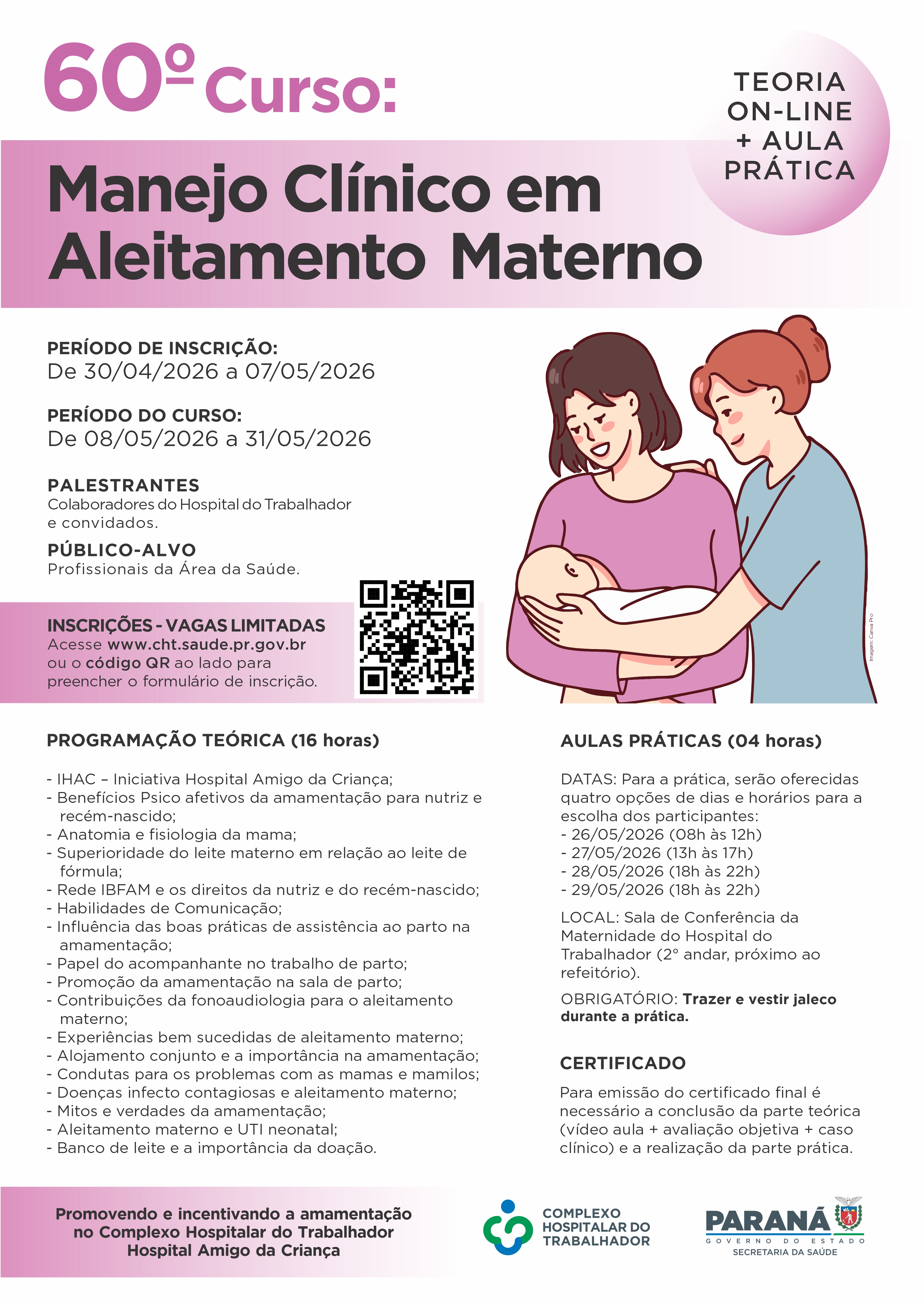 Notícias 60º Curso de Manejo Clínico em Aleitamento Materno 29/04/2026 - 16:54 O Complexo Hospitalar do Trabalhador divulga o 60º Curso de Manejo Clínico em Aleitamento Materno aos profissionais da saúde. Inscrições de 30/04 a 07/05/2026. Compartilhe: Voltar Início Imprimir Baixar